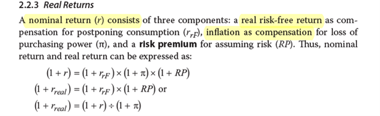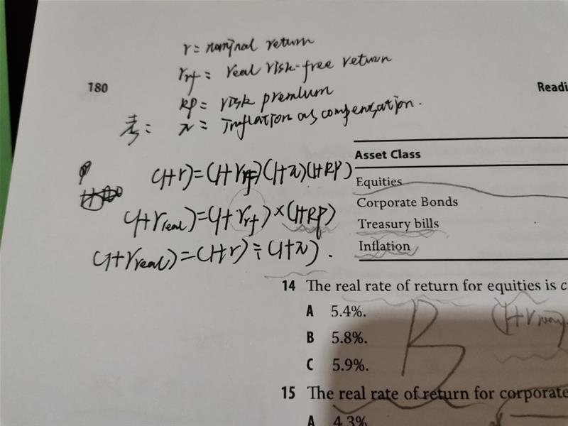 后两题考的是名义利率和风险溢价的关系。本题给出的Treasury bills利率是国债利率,表示的是名义的无风险利率。所以(1+T-bill)(1+risk premium)=(1+资产利率)