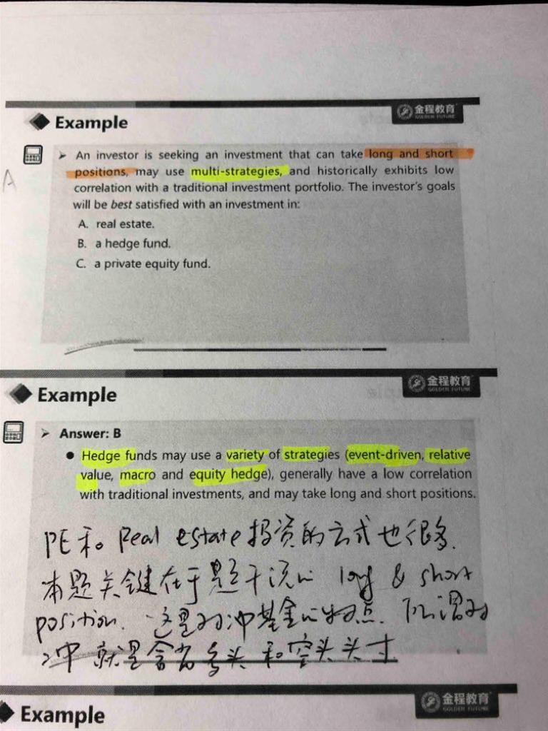 老师您看这一题~ 当时您说这一题就是通过long and short position来判断出hedge fund~ 所以我才有之前的问题~ 可以麻烦老师解释一下pe 和 real estate的做多做空吗~