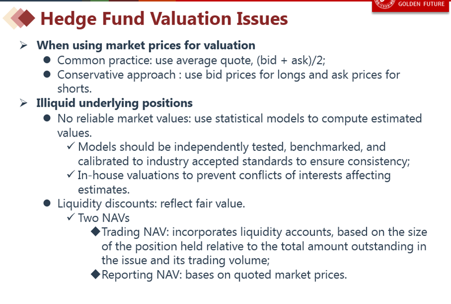 许多从业人员认为,流动性折价是反映公允价值的必要条件。这导致一些基金有两个资产净值-用于交易和报告。本基金可使用平均报价作报告用途,但为交易用途应采用流动性折扣。