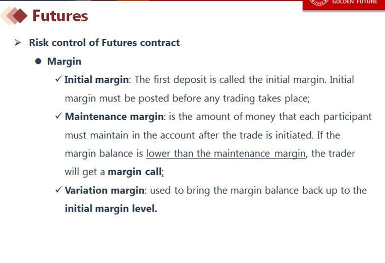 期货的margin account规定了是低于maintenance要补交,所以一定要在maintenance margin之上。见下图讲义