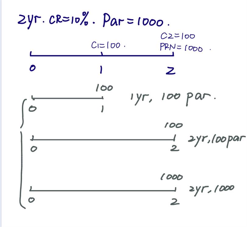 如图,将一个2年期、CR为10%、面值1000的附息债券的coupon和本金分别剥离成不同par和期限的零息债券。