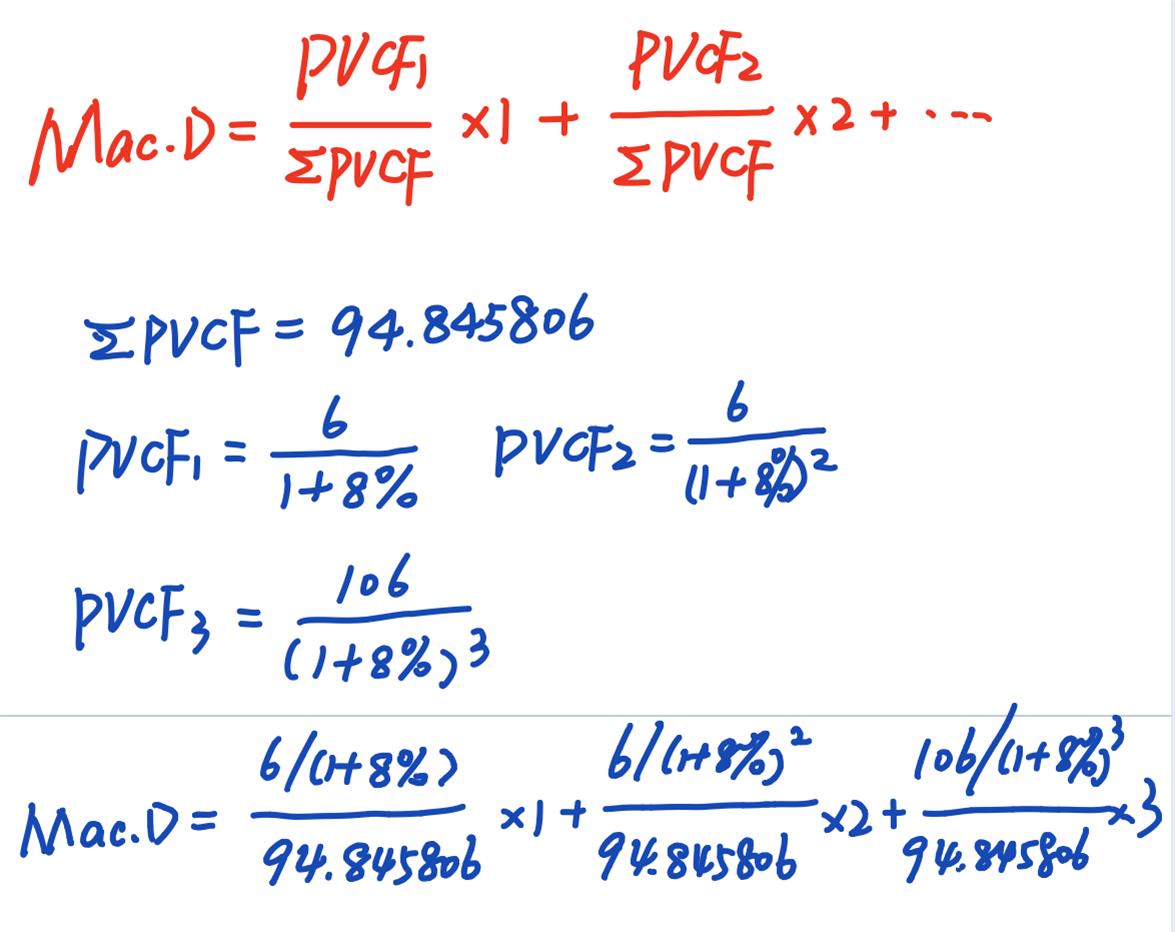 首先macaulay duration的公式要明确,见下图红笔字。因此,分子不是单纯的现金流,而是现金流的现值,分母也不是债券的面值而是债券的价格。