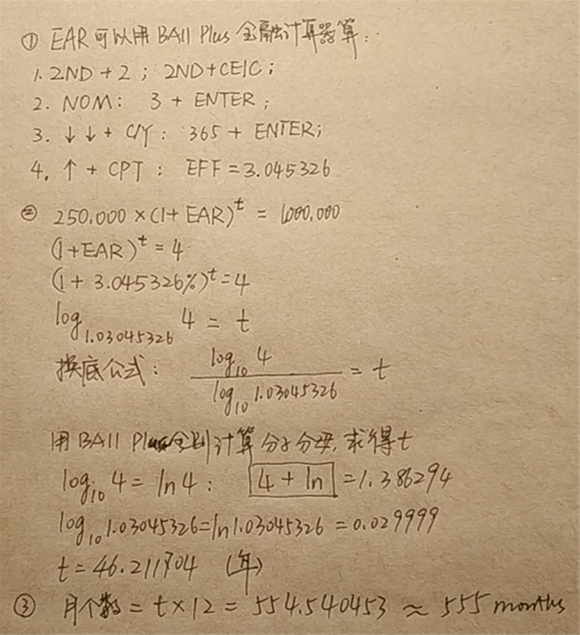 第二部分铅笔画出的部分,N代表几“年”,N=46.21代表的是46.21年,EAR=3.0453,其实将等式变形你应该就懂了:250,000(1+EAR)^N=1,000,000