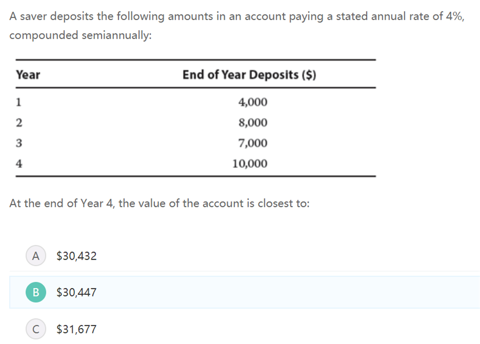 我的回复是:Deposits可以看做是一笔一笔现金流,Cash flow(CF)发生的时间点,间隔为1年,对应的利率应该是1年期/年化的利率,那么题目信息是年化4%还要考虑复利计息的因素求得EAR,这是一个匹配的原则。如果CF是半年存一次,此时需要用4%/2来计算。