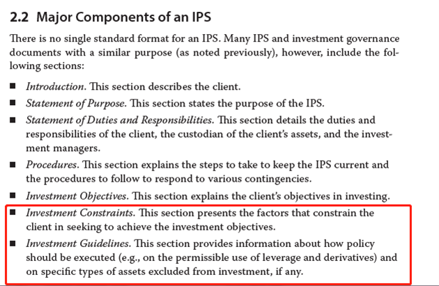 同学你好。前面把objective和constraint拎出来,是为了在这一块进行更加详细的描述。investment guideline的内容是如何去执行投资的方案,所以会涉及到客户的投资目标和限制。