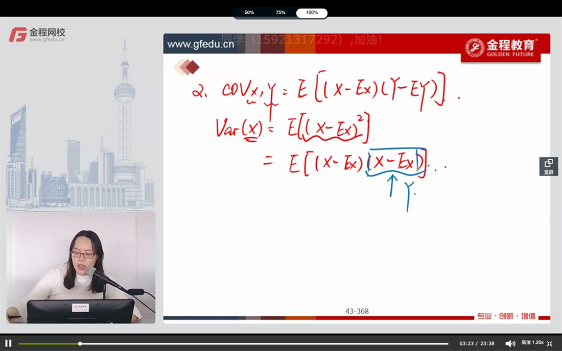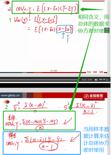 Covariance (x,y)有不同的形式,请参考我上传的截图,绿色对应总体,绿色1是在求E,expected,期望,求期望就是在求平均,等价于绿色2求平均。