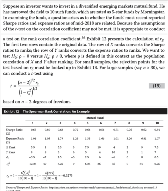 如下图所示例子,是检验10个公司sharp ratio和expense ratio排序后,X和Y是排序值,我们不知道这些排序值的分布特征,也就是均值和方差这类数据,若要研究这两个排序值的相关关系,此时用到的是非参数检验。