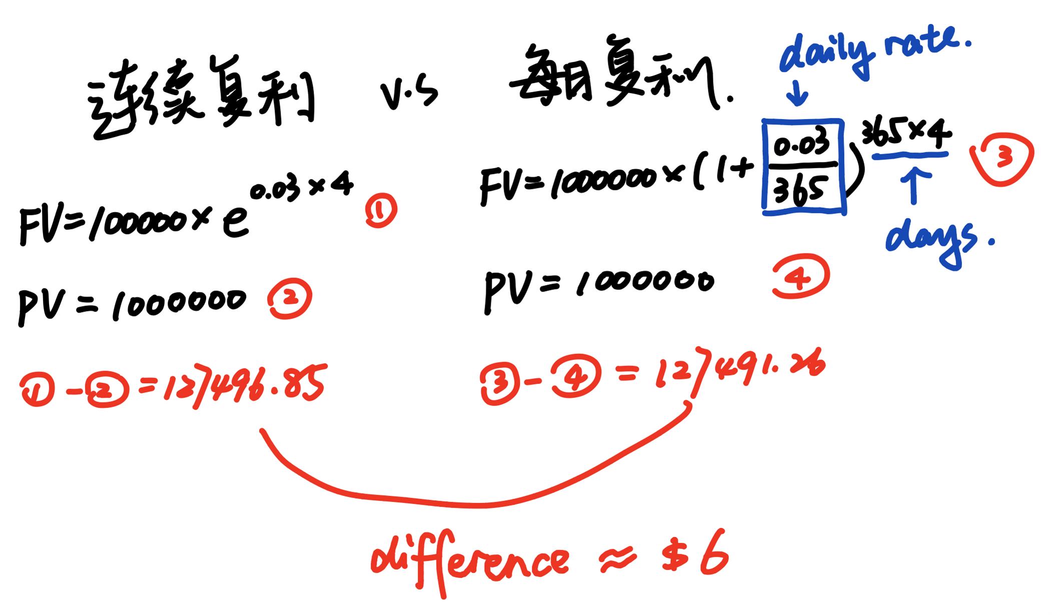 同学你好,计算过程见图。本题问的是连续复利与每日复利两种复利方法下的收益区别,那么根据两种方式分别计算出收益,再相减得出差值即可。