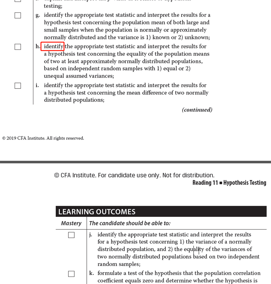 计算确实不要求掌握的,因为原版书上是这样描述的:“identify the appropriate test statistic and interpret the results for a hypothesis test”,其中用的是identify,而不是calculate,换句话说,我们应该掌握定性的知识,原版书上的一些题目算是超出了考查范围,可以适当了解。