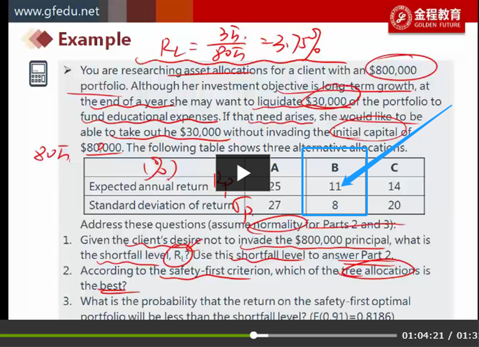 表格里的是三种投资的信息,其中B这种,有11%的均值,8%的标准差