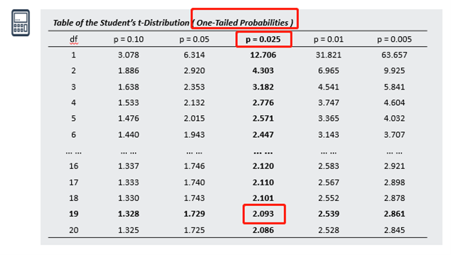 查表均是查单尾,这个是没有问题的。如图所示,已经将alpha除以2得到了单尾对应的面积,然后找到critical value是2.093,和检验统计量(计算出来的0.497)相比,检验统计量没有落在拒绝域外边,所以无法拒绝原假设