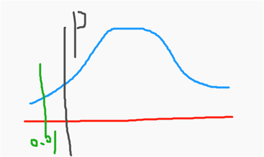 再结合下图来看,绿色的是α的面积,黑色的是P的面积(左边面积),P并没有完全落于拒绝域中,所以没办法拒绝原假设