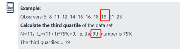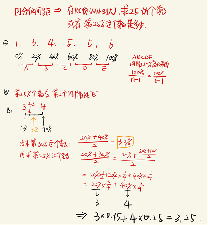请问下这道题,我用location=(n+1)*25%四分位=7*25%=1.75,然后从左到右数,为3到4之间,离3有0.75,离4有0.25,所以3*0.75+4*0.25=3.25,然后第三个四分位75%则location=7*75%=5.25,则为5到6之间靠近5,则为5*0.25+6*0.75=5.75,这样计算正确吗?不理解计算第二步和第三步的意思,以及线性插值法怎么插进去的?