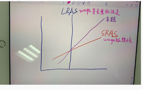短期是向上倾斜的斜线,我们假设短期工资不变,现在工资变成短期也可变,所以短期的曲线会更接近长期,所以会更陡