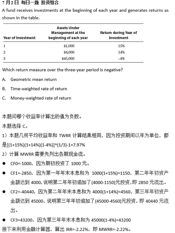 一般情况下用单利年化就可以了,但是在组合当中,部分题目也会要求用更精确的复利年化。考试的时候,建议优先用单利年化,如果没有对应的答案,再考虑复利年化。