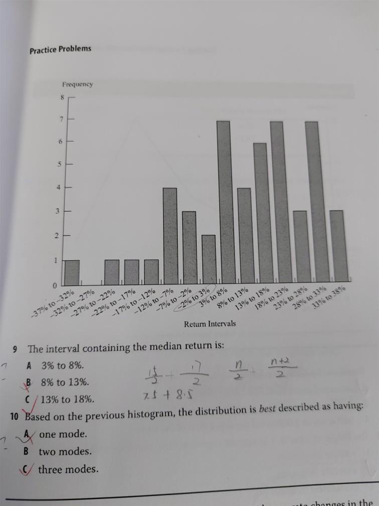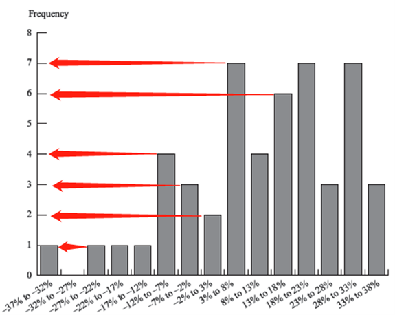 如附图所示,一共有50个观测值,中位数在25和26位中间,所以在第10个“柱状”对应的区间,8% to 13%