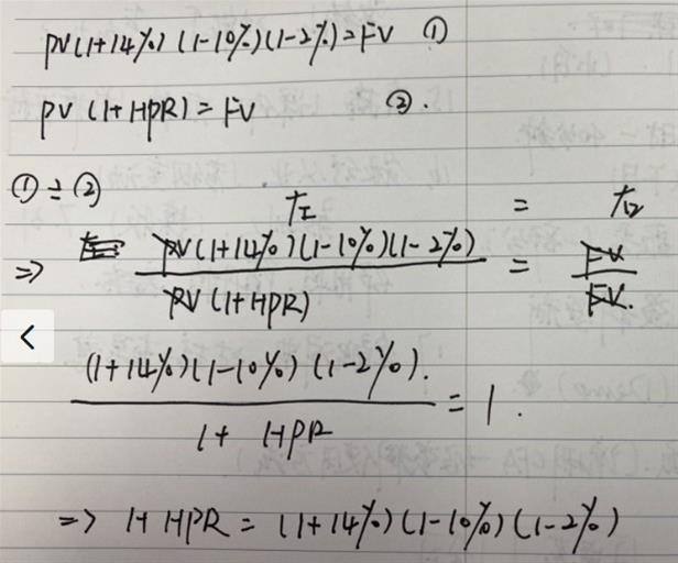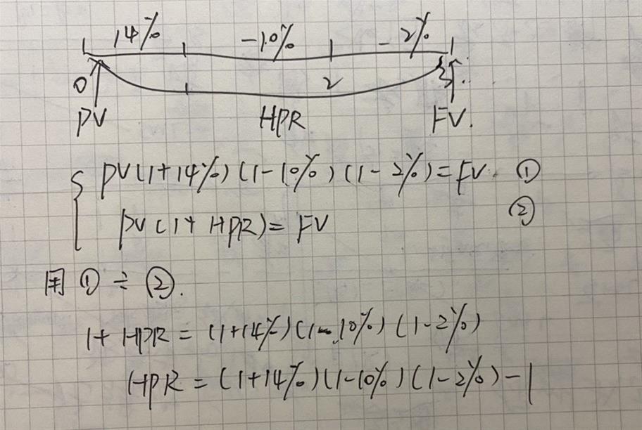 相当于PV要按照HPR利滚利3期,才能得到第三年年末的FV,所以第二个公式就会变成PV*(1+HPR)^3=FV. 此时,就需要开3次根了。