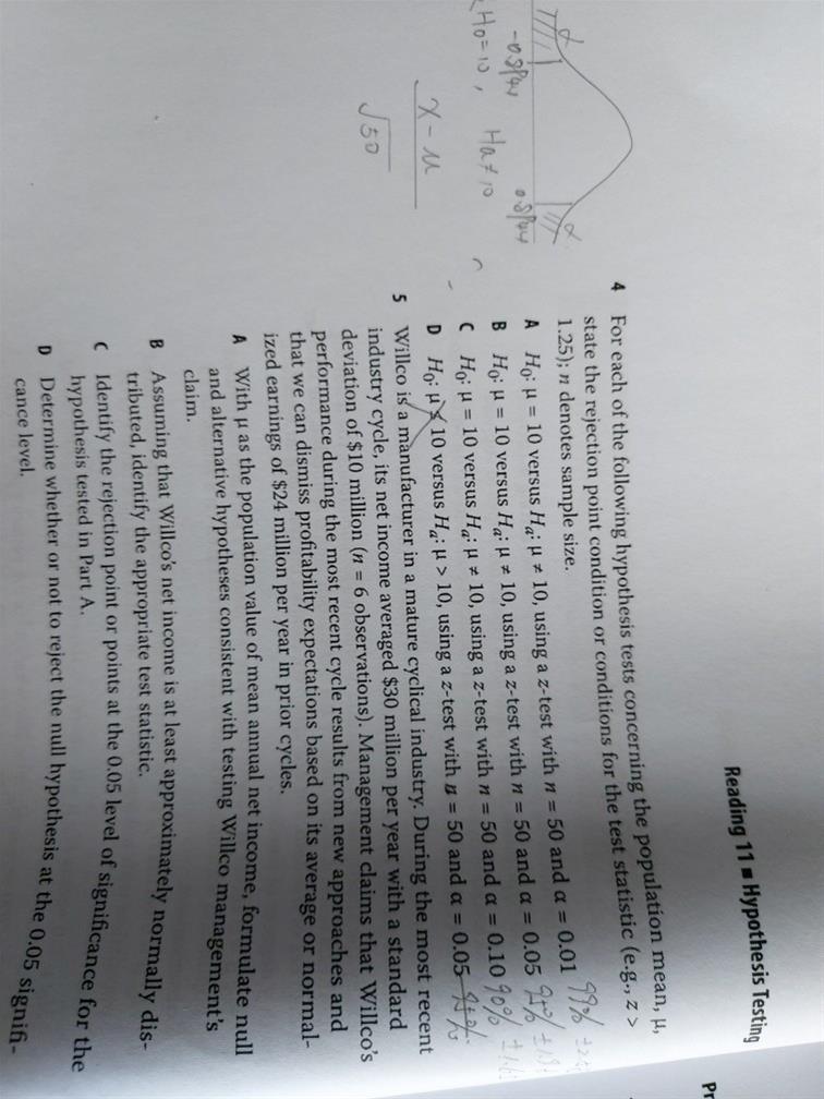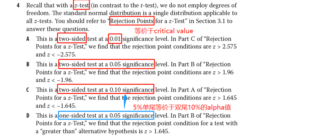这个题目不需要全部的步骤,只需要其中的一个步骤,那就是确定CV,critical value,也就是rejection point,因为题目已经要求用z-test,说明这种情况下,样本服从标准正态分布,直接用几组特殊值即可。不用管df,因为在t-test中才需要考虑自由度。