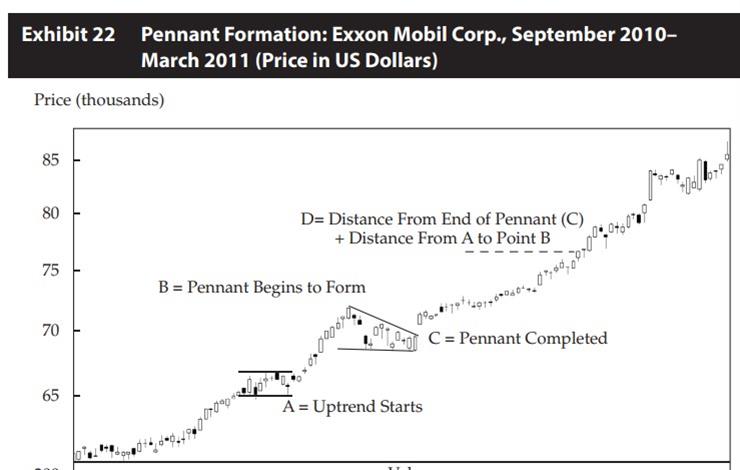 但是旗形图最大的特征是,它的持续时间比较短。一般只有一周。但是普通的traingle或者rectangle有可能是一个月左右的。这是他们两个的区别。