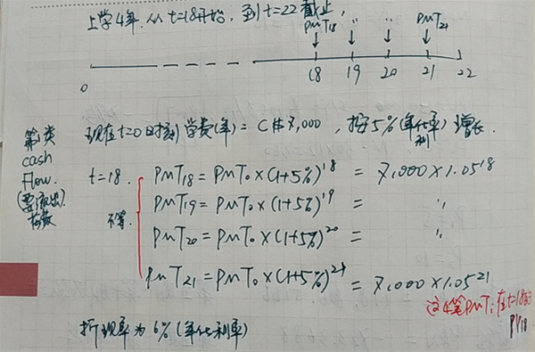 每年学费不变,因为题目描述为“at $20,000 per year”。(此类题目可以使用画图方法使得计算逻辑清晰一点)