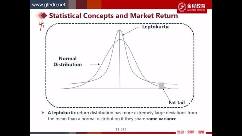 为什么高峰等价于肥尾呢?这里有一个前提条件,所要研究的分布与正态分布的方差相同(截图汇最后有一个“same variance”信息),即两组数据通过方差衡量出的离散程度相同。若所要研究的分布为高峰,说明这组数据在靠近均值的部分数据多,分布比较集中。为了保证总体的离散程度相同,则在远离均值的地方分布必须比较松散,即极值出现的可能性比较高,所以会出现“肥尾”的现象。(这一段课上老师应该是讲解过的可以复习一下)