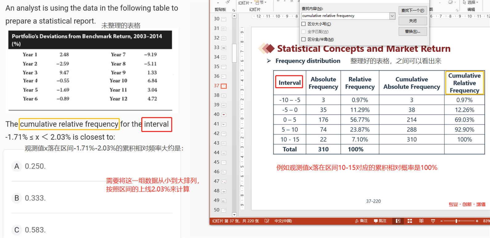 cumulative relative frequency指的是累积相对频率,本题中应该记录所有小于上限“2.03%”的观测值,然后除以总的观测值个数。