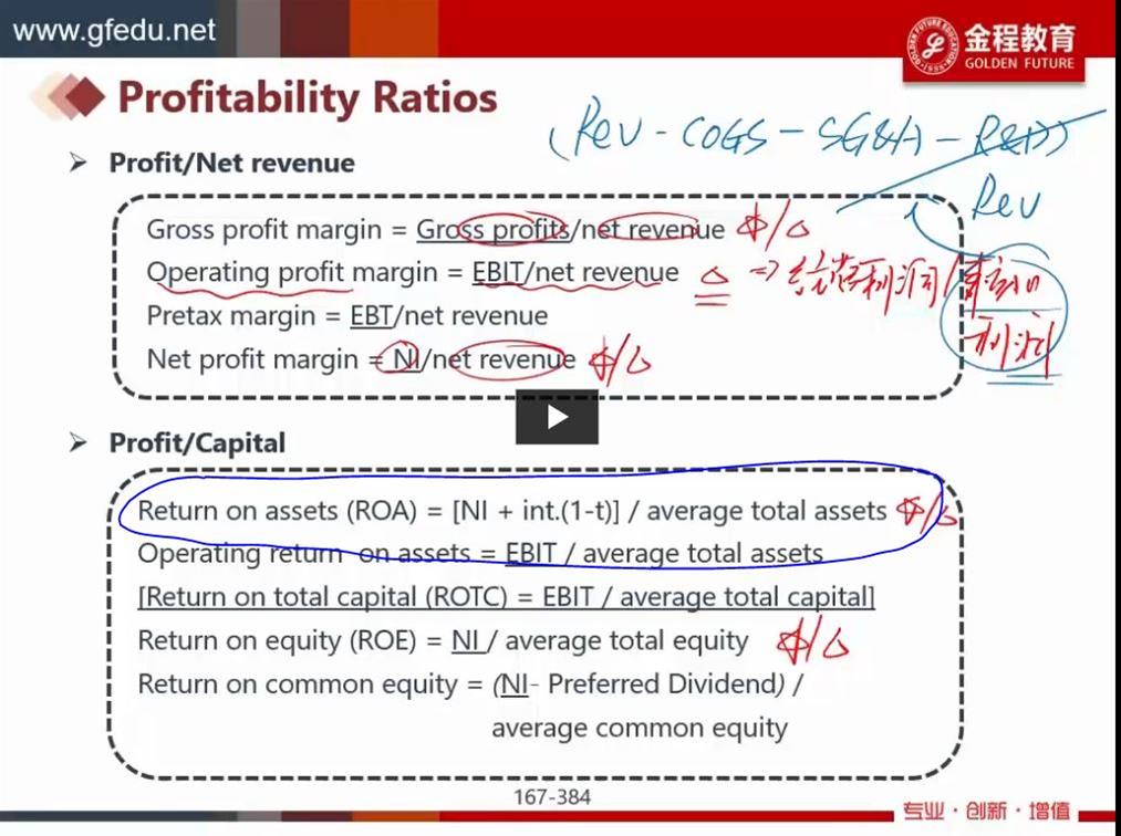 ROA=NI/average是通用公式,我们讲义上为什么在分子上加上了int(1-t)是因为。分母asset是公司总资产,公司总资产是股东和债权人共同作用的结果。所以说为了保持上下统一,分子上也会加回付给债权人的利息。