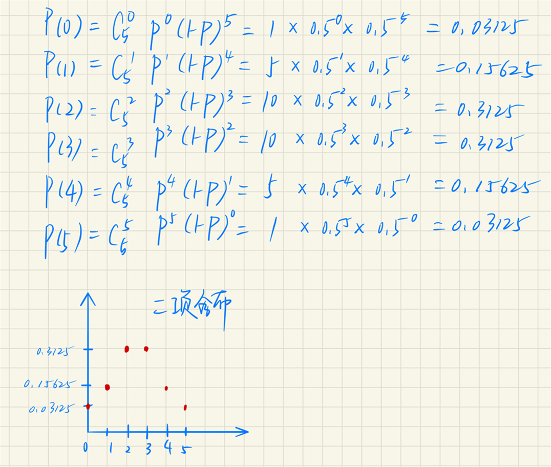 举例如附图,实验次数为5,P(3)表示5次试验成功3的概率,图中有6个点离散分布,并不是均匀分布的,因为0-6中,只有6个点可以取到,例如P(1),但是其余点是取不到的,例如P(1.1)