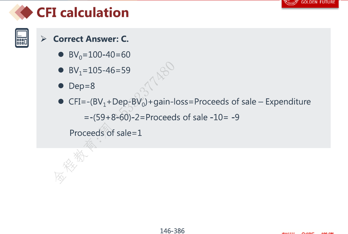 CFI=proceeds of sale(投资活动现金流流入)-purchase(购买新的设备,投资活动现金流流出)