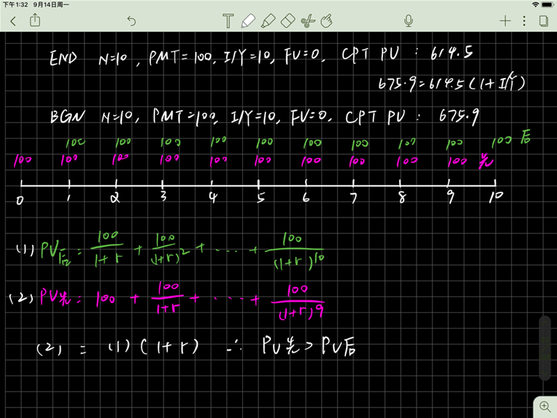 为什么PV先付年金大于PV后付年金?老师说多滚了一期利息,应该是小于呀?