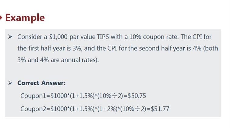 1.确定一下,从公式看coupon,受inflation和adjust par value的影响,coupon rate不变,对不? 2.请举个计算TIPS coupon payment的例子吧,谢谢!