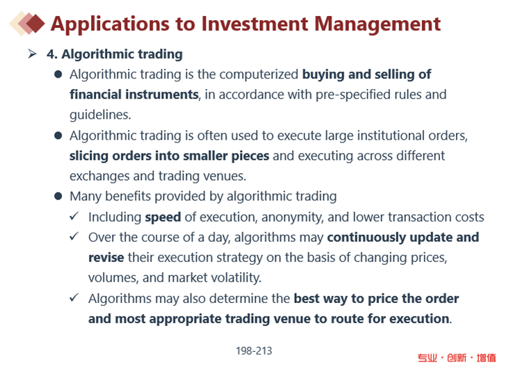 3.C选项正确,交易的地点的增加。正是因为交易的地点越来越多,一只股票可能会在多个交易所进行交易,所以对于信息处理的要求在进一步增加,所以算法交易才会被使用,从而分析在哪一个交易场所是最优投资价格,并且快速决断买卖。