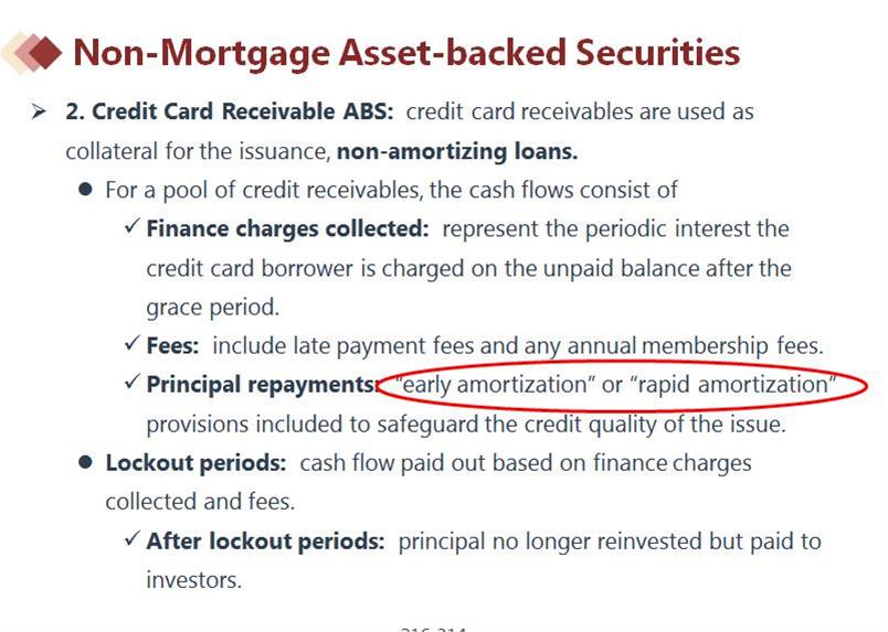 C是正确的。在信用卡应收账款中,唯一可以改变本金现金流的方法是触发提前摊销条款。这些条款都包含在ABS结构中,以保障发行的信用质量。