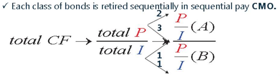 sequential-pay tranches ,首先都是还利息。先还ABC利息,多了还A本金;A全部还完后,还BC利息,多了接着还B本金;最后还C的利息和本金