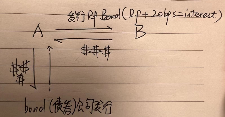 A买了(左下角Bond,以bond为基础资产发行 risk free bond卖给B,是在riskfre的基础上加一点利息,例如20bps。