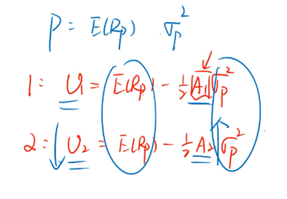 25题目:针对同一个投资组合来说,研究两个投资者的情况,如附图,1和2分别代表投资者1和2,研究的这个投资组合对于投资者1最优,同样投资组合的E(Rp)和σp是相同的,两个蓝色圈圈是相同的,投资者2的A风险厌恶水平更高,对应的效用更低。