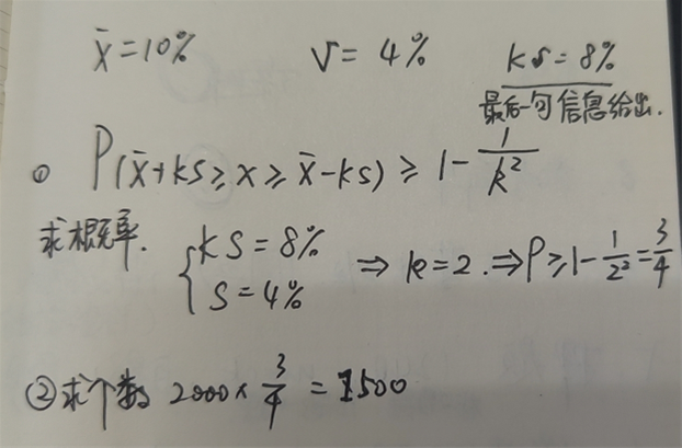 由题目最后一句话,可以知道均值上下8%的区域对应的是k倍标准差,已知标准差为4%,所以求得k为2,然后概率可以求出为75%,最后乘以总的观测值即可