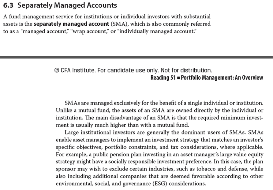 SMA仅为单个个人或机构的利益而管理。与共同基金不同的是,SMA的资产由个人或机构直接拥有。SMA的主要缺点是:通常所需的最低投资额度远高于共同基金。