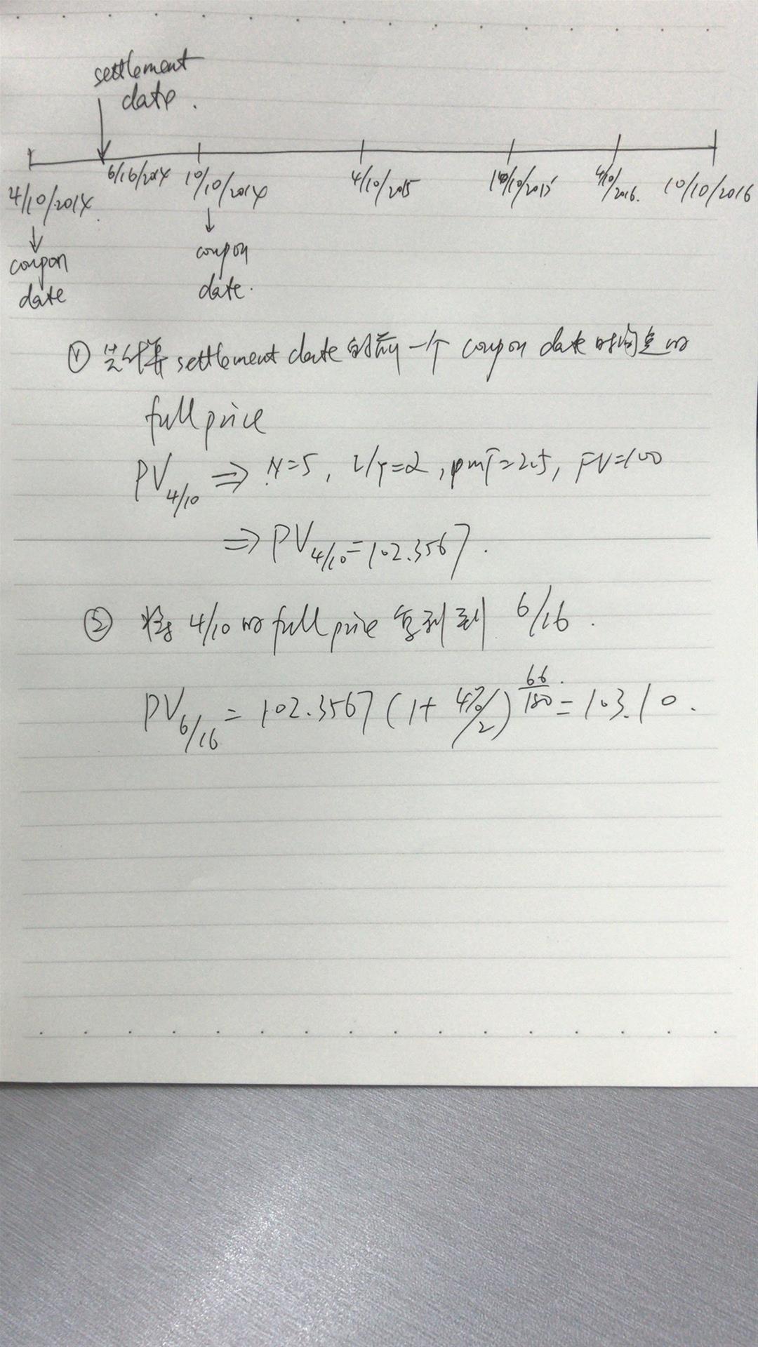Bond G, described in the exhibit below, is sold for settlement on 16 June 2014. Annual Coupon 5% Coupon Payment Frequency Semiannual Interest Payment Dates 10 April and 10 October Maturity Date 10 October 2016 Day Count Convention 30/360 Annual Yield-to-Maturity 4% 19. The full price that Bond G will settle at on 16 June 2014 is closest to: A. 102.36. B. 103.10. C. 103.65. 麻烦老师帮忙讲解一下这道题,这个知识点,听视频课,有点似懂非懂的,绕晕了。谢谢先。