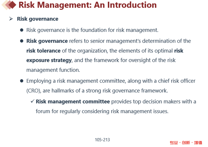 风险治理不是那些在业务线上降低风险的方法。相反,它是关于为整个企业,去建立一个适当的风险水平。C这种处理风险的细节属于风险管理和基础架构。