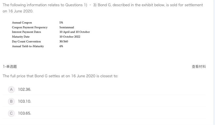 最后:Full Price = Clean Price +Accrued Interest, 那么103.10=Clean Price+0.92,Clean Price=102.18