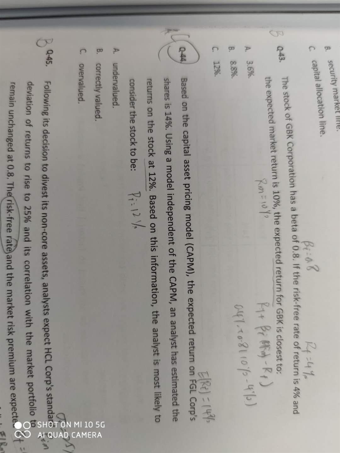 组合百题第44题,the expected return on shares is bigger than the outcome using the CAPM, 所以觉得答案应该是A,不是C吧。还请确认、