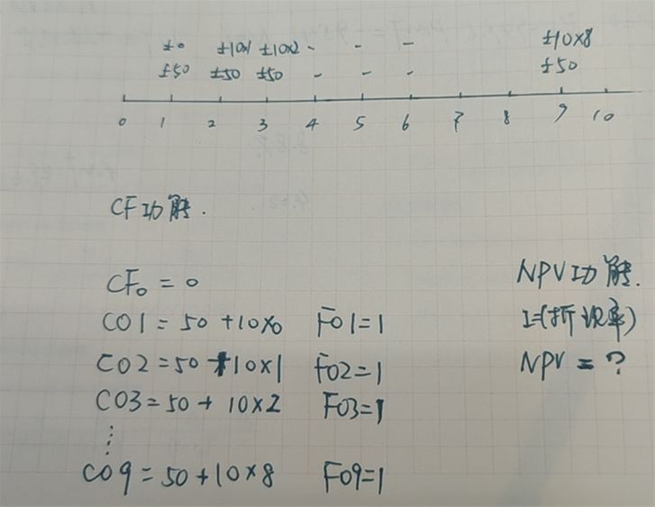 老师,我在做题的时候碰到一道题如下: Suppose that £50 will be paid into an account at the end of one year from now and that the amount paid into the account will increase by £10 at the end of each subsequent year for nine years. The present value of the amounts that will be paid into the account will be? 答案是702.61,但是我不知道应该如何画时间轴和计算,还请老师解答。