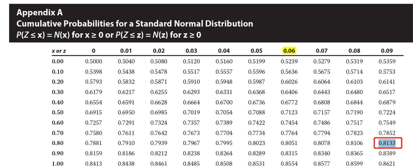 3.题目给出的图表是一个节选,从1.20开始,完全的图表有附图(示例而已),从0.00开始,表示均值0右边所有“正”的点,以及对应的标准正态分布的面积。