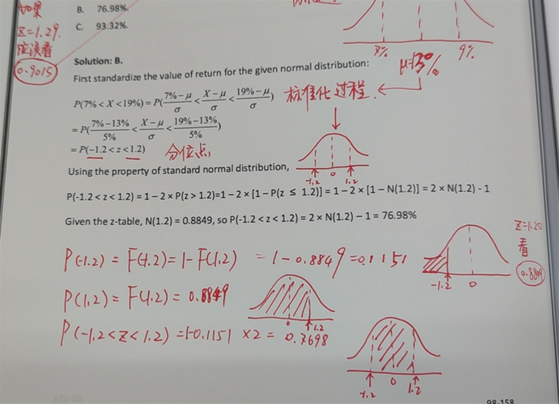2.由标准化的过程可以知道,均值为0%时,对应-1.2和1.2这两个点,对应分布左尾的面积,是可以通过查表知道的,并且和1中的两个面积相同