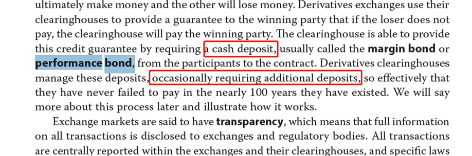performance bond本质是打入margin account的cash deposit,如果把C改成正确的,应该加入Both双方强调无论是买方和卖方都是应该存入资金的,另一个删去at initiation期初,因为cash deposit在margin保证金账户不够的时候需要补交保证金,也是cash deposit/performance bond。