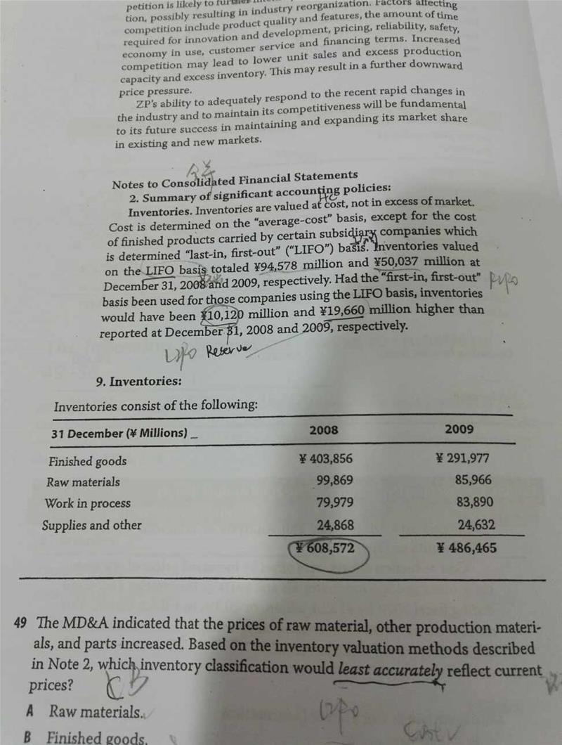 不好意思老师,我害死不懂,except不是除 之外的意思吗。刚看了答案,后两个选项是MD&A中披露出来的,我想问的是我当时直接看的存货那个表格,看数值是下降的就没选A,但是我后来认真看其他的信息发现表格上的那段文字里说的存货值为什么和表格中试不一样的呢,就是94578 50037和608572 486465为什么是不同的呢?