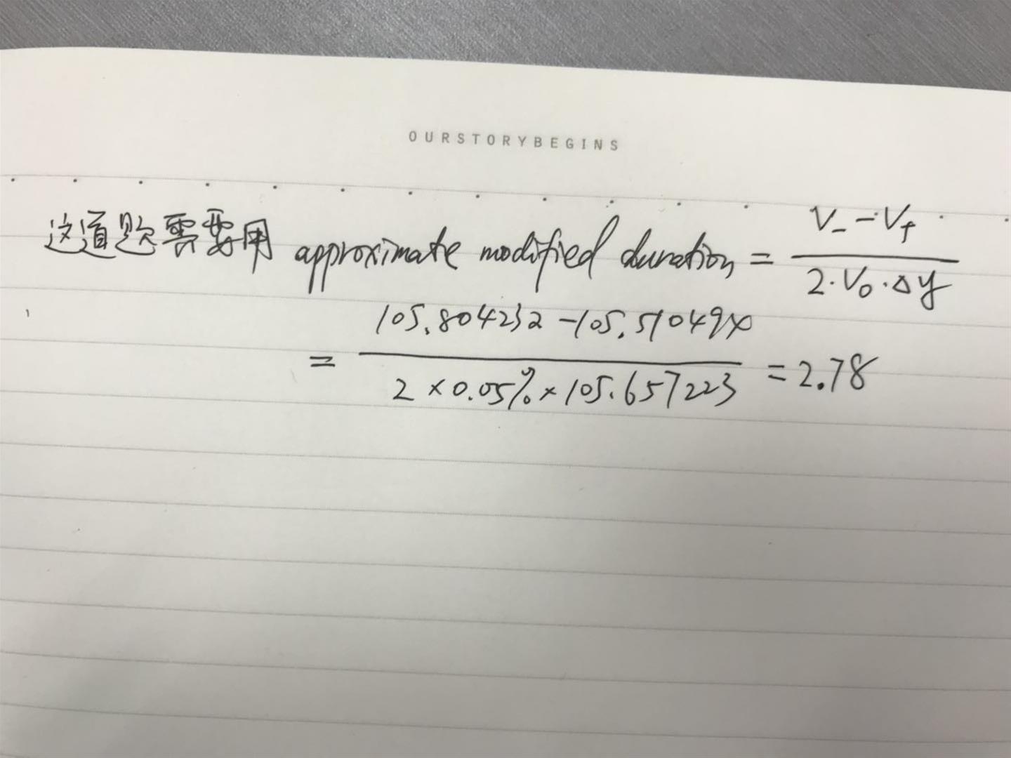 7. An investor buys a three-year bond with a 5% coupon rate paid annually. The bond, with a yield-to-maturity of 3%, is purchased at a price of 105.657223 per 100 of par value. Assuming a 5-basis point change in yield-to-maturity, the bond’s approximate modified duration is closest to: A. 2.78. B. 2.86. C. 5.56. 麻烦老师讲解一下。谢谢。