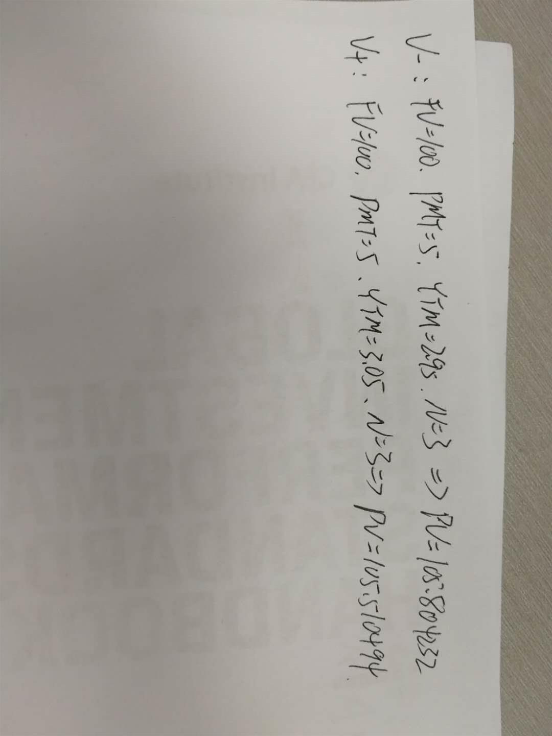 哦,这下明白了,是要计算出每期PMT在利率上升后,下降后的折现现值之和。谢谢老师啦。