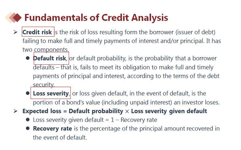 见下图讲义,一个是违约的可能性,一个是损失金额,加起来构成credit risk